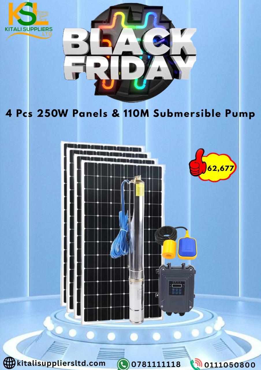 Equipped with four high-efficiency 250W solar panels (total 1000W) and a robust stainless-steel submersible DC pump, it can lift water up to 110 meters—perfect for deep well installations and high-head water delivery. The brushless DC motor ensures long-lasting performance, quiet operation, and superior energy efficiency.
