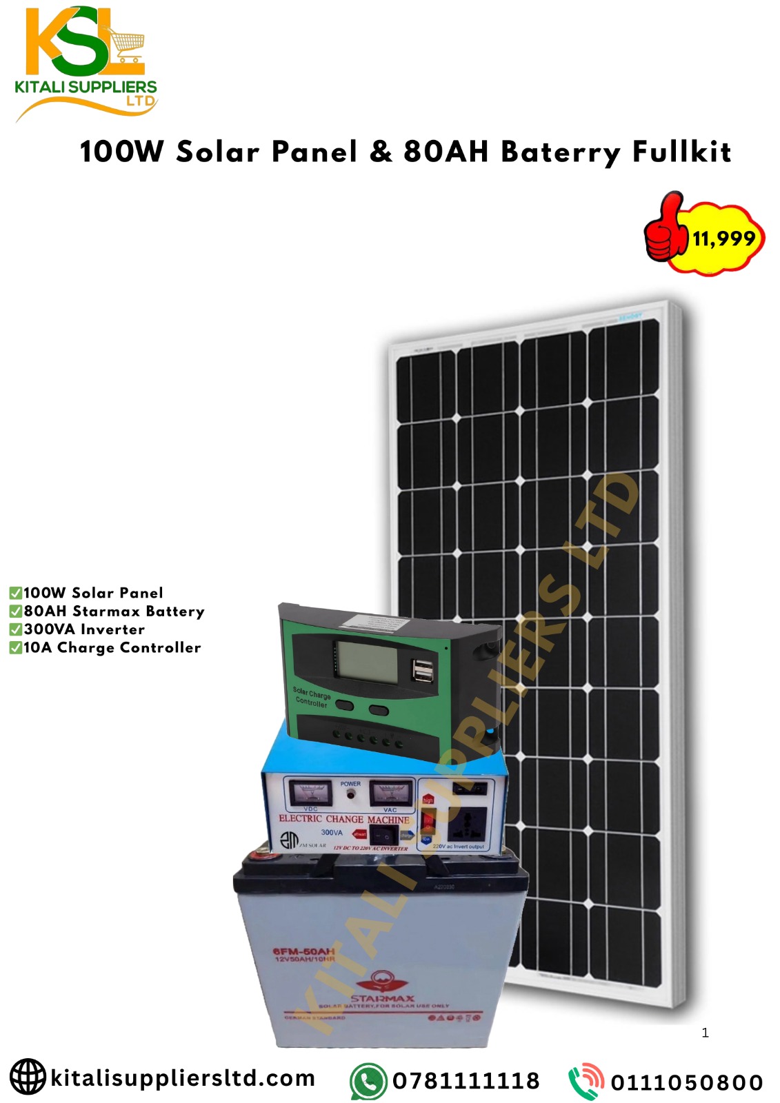 Power your small appliances, lights, and devices anywhere with this complete 100W Solar Panel & 80Ah Battery Full Kit. Ideal for cabins, RVs, camping, boats, or backup during outages, this all-in-one kit includes: