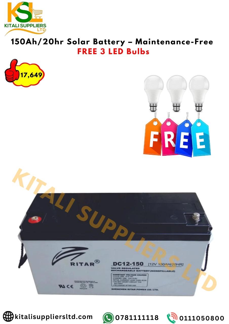 The 150Ah/20HR Maintenance-Free Solar Battery is a durable, deep-cycle energy storage solution designed for solar systems, inverters, and backup applications. Built to deliver long-lasting performance, this battery is completely maintenance-free, making it ideal for home, business, or off-grid use. With a high discharge rate and extended lifespan, it ensures reliable power during outages or for daily solar operations. This offer also includes 3 FREE energy-saving LED bulbs, perfect for immediate lighting setup with no extra cost.