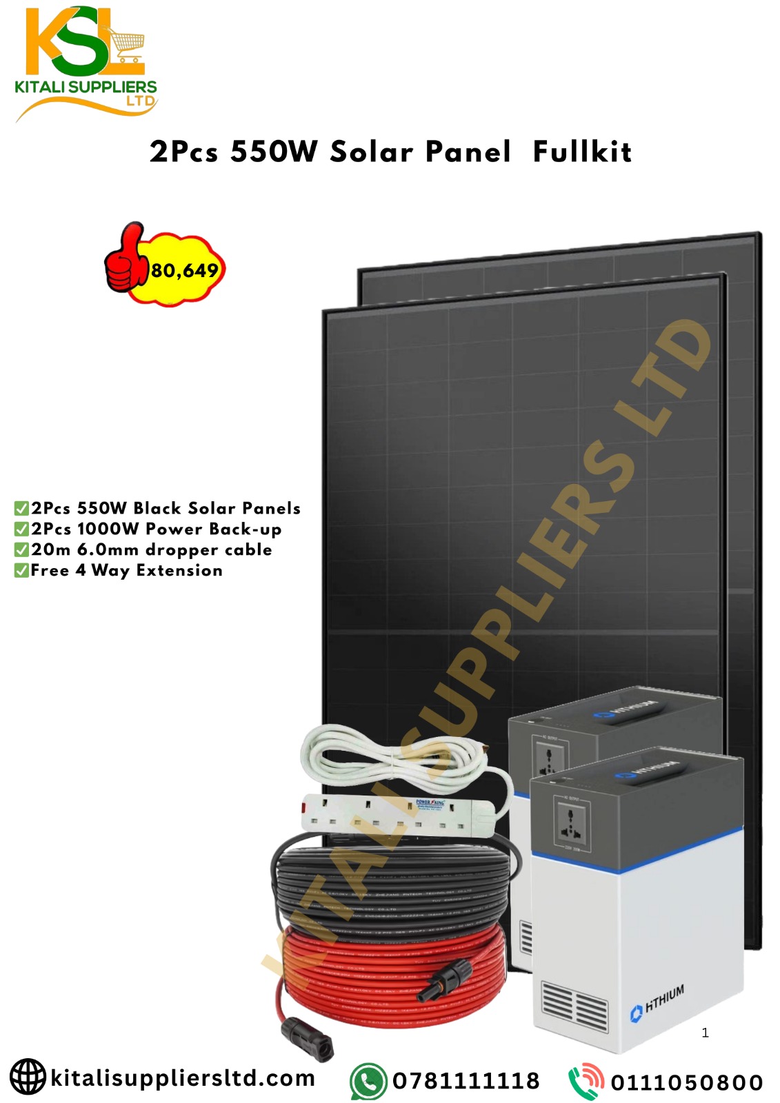 Power your home, cabin, or off-grid setup with this comprehensive 2Pcs 550W Solar Panel Full Kit, designed for serious energy independence. This all-in-one solution includes 2 high-efficiency 550W black solar panels, 2 powerful 1000W power backup units, a 20-meter 6.0mm² dropper cable, and a free 4-way extension – making installation and operation seamless right out of the box.
