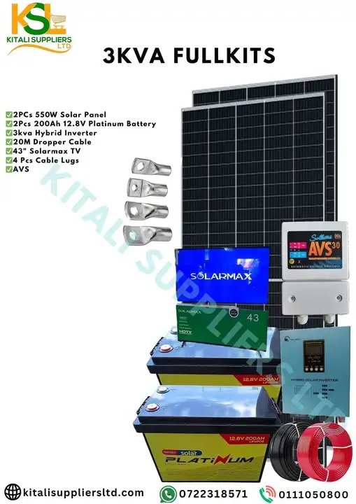 Complete Solar Kit – 2×550W Solar Panels + 2×200Ah 12V Lithium Batteries + 3kVA Hybrid Inverter + 43" Solarmax TV + Accessories