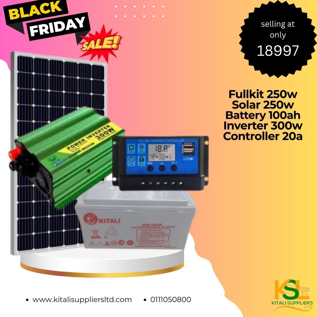 The Fullkit 250W Solar Power Kit is a compact, efficient, and reliable off-grid energy solution designed for small homes, shops, cabins, or emergency backup. It includes a high-performance 250W solar panel, a durable 100Ah deep cycle battery, a 300W inverter for running essential appliances, and a 20A charge controller to ensure safe battery charging and power regulation. This kit is ideal for areas with unstable grid electricity or for users looking to reduce reliance on traditional power sources.