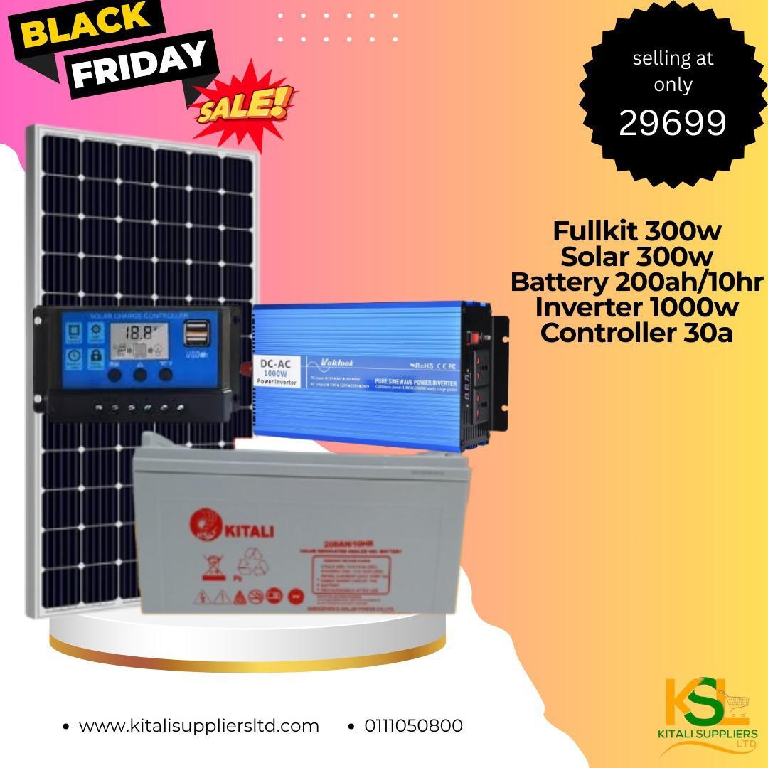 The Fullkit 300W Solar Power System is a reliable and high-performance off-grid energy solution, tailored for homes, small businesses, and remote locations. This complete system features a 300W solar panel for efficient energy capture, a 200Ah/10hr deep cycle battery for extended storage, a 1000W inverter to power essential appliances, and a 30A charge controller for optimal power regulation and battery protection. Whether you're living off the grid, preparing for power outages, or reducing energy costs, this system delivers dependable and eco-friendly energy wherever it’s needed.
