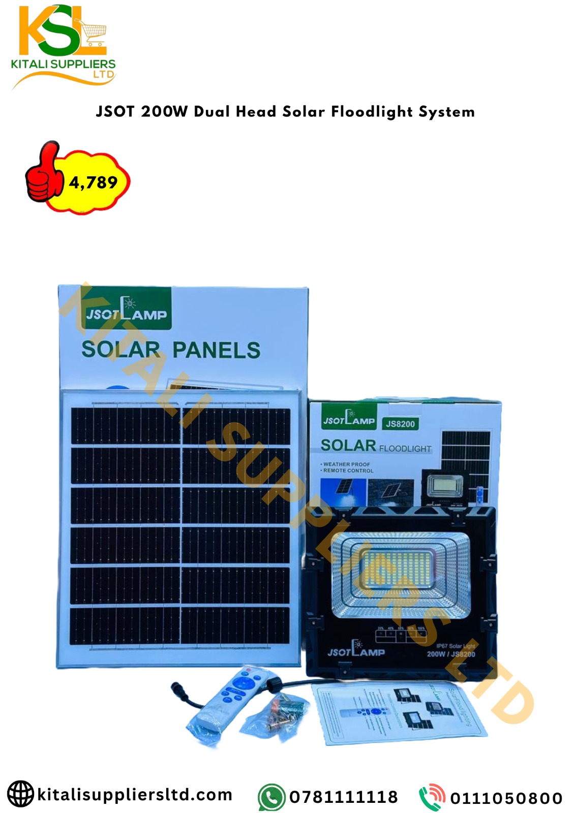 Easy to install with no wiring required, the JSOT 200W floodlight system is an ideal choice for reliable, cost-effective, and maintenance-free outdoor lighting.