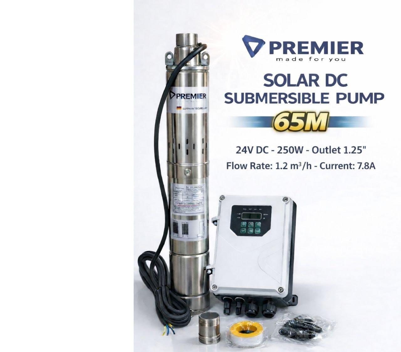 Premier 65M Solar DC Submersible Pump – 24V 250W Borehole Pump (1.25” Outlet)
