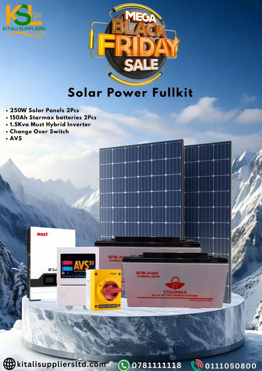 This complete kit includes high-efficiency solar panels, a durable inverter, a long-life battery, and a smart charge controller — everything you need to harness solar energy and power your essential appliances. Perfect for homes, offices, RVs, farms, cabins, schools, and off-grid locations, the Solar Power Fullkit offers clean, quiet, and cost-effective energy 24/7.