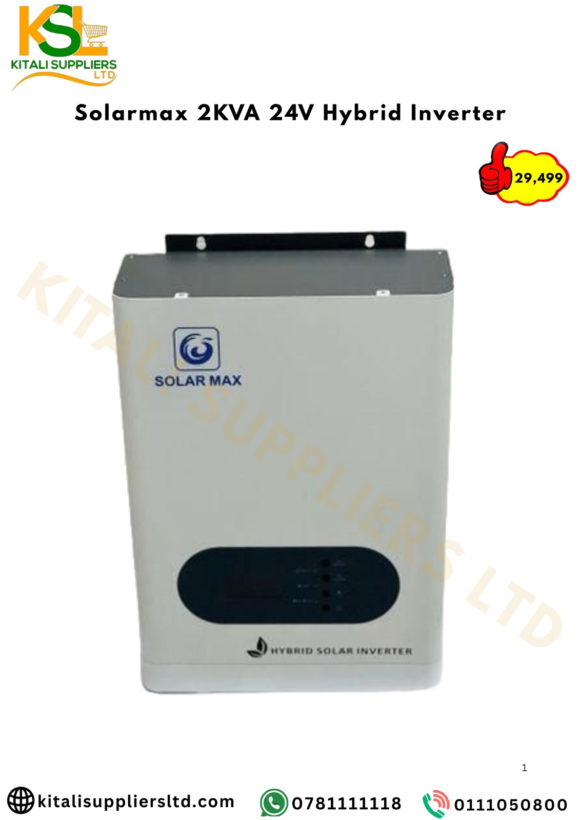 The Solarmax 2KVA 24V Hybrid Inverter is a compact, high-efficiency power solution designed for residential and small commercial solar applications. Integrating a pure sine wave inverter, MPPT (Maximum Power Point Tracking) solar charge controller, and AC charger, this hybrid inverter ensures seamless power supply by intelligently managing solar, battery, and grid inputs.