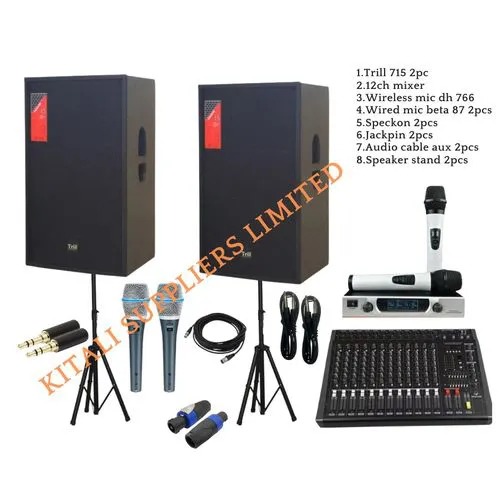 Trill Speaker 715 (2PCS) with 12CH Mixer, Wireless Mic DH766, Beta 87 Wired Mics (2PCS), Speckons, Jack Pins, Audio Cables & Speaker Stands – Complete Sound System Package