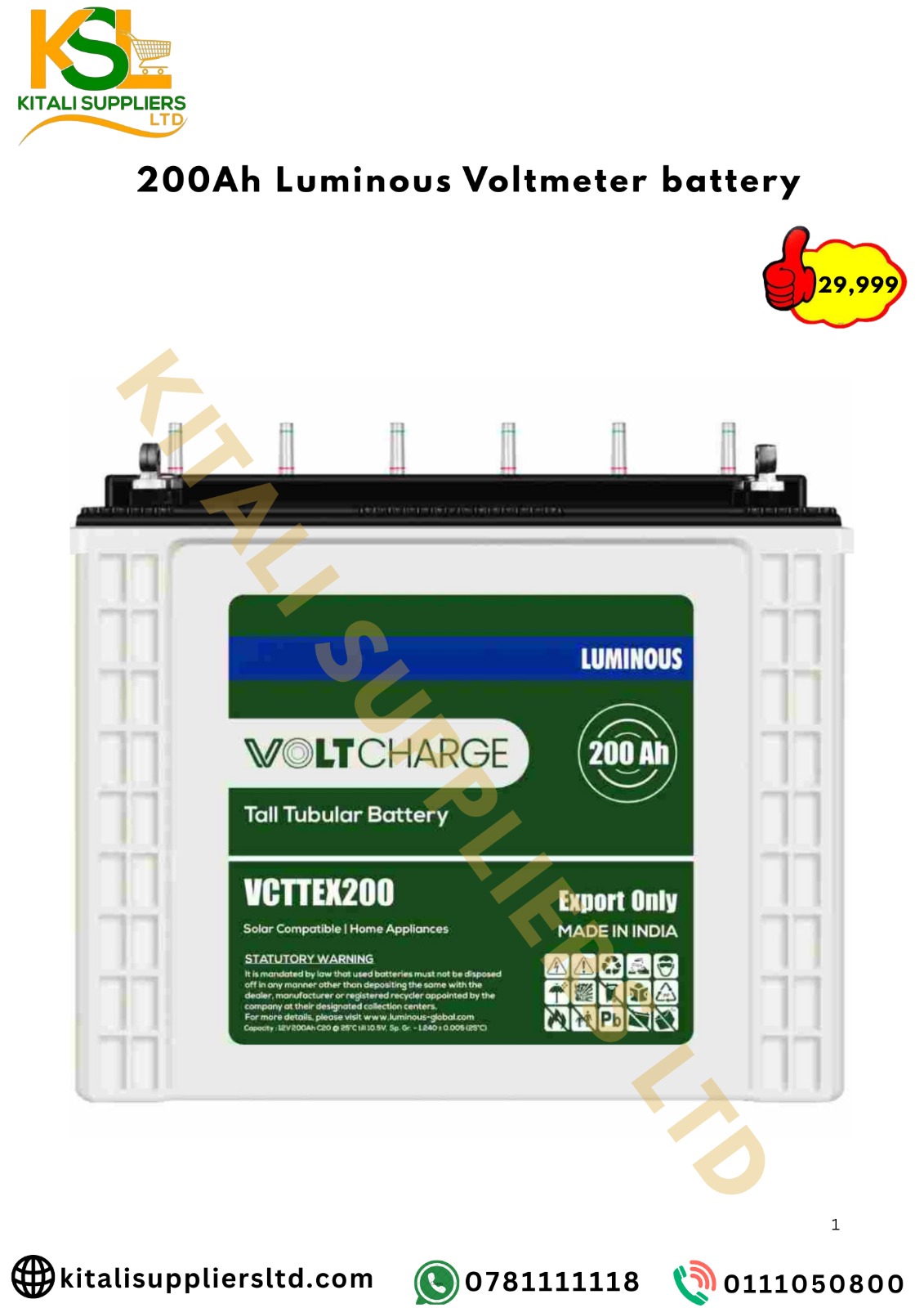 The Luminous 200 Ah Volt‑Meter Battery is a high-capacity, deep‑cycle power storage unit engineered for reliable performance, extended life, and real-time voltage monitoring. Designed for solar installations, inverter backup systems, off-grid households, and heavy-load usage, this battery merges advanced tubular plate technology with integrated voltage display (voltmeter) so you always know the battery’s state of charge at a glance.