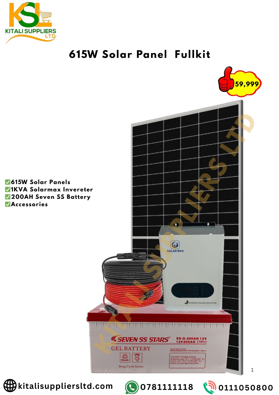 Power your home, RV, cabin, or workspace with this high-performance 615W Solar Panel Full Kit. Designed for medium to large energy needs, this comprehensive solar solution includes everything required for a reliable and sustainable off-grid setup.