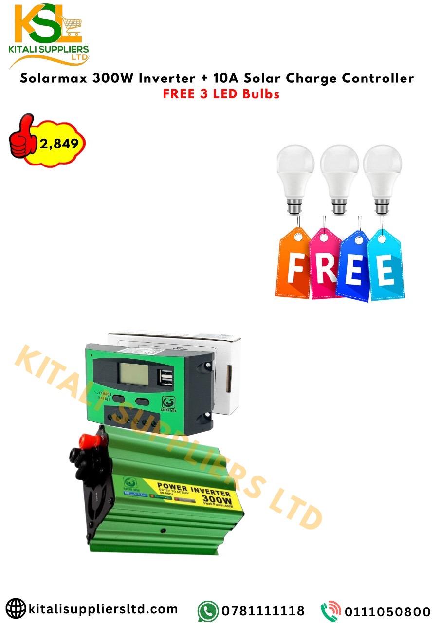 The Solarmax 300W Inverter + 10A Solar Charge Controller is a compact and efficient power solution designed for reliable off-grid and backup energy. Ideal for homes, small offices, or outdoor setups, it provides clean and stable power for your essential devices. This combo includes FREE 3 LED bulbs, making it a complete starter kit for solar energy users. The 300W inverter efficiently converts DC to AC power, while the 10A charge controller protects your batteries from overcharging and ensures longer battery life.